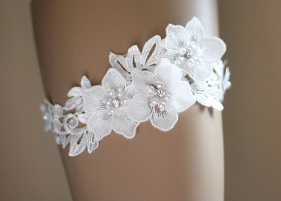 Floral Wedding Garter, rhinestone garter, tropical garter, lace and flower garter WHITE E27 by HeirloomGarterCo