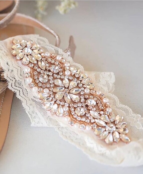 This is a beautiful custom sized bridal garter set handmade with ivory stretch lace, clear crystal rhinestones in silver color settings and pearl beading. These garters are stunning! The larger one is 2" wide and the smaller one is approximately 1.5" wide.