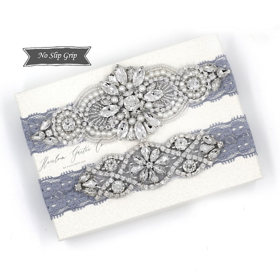 Wedding Garter, NO SLIP Lace Wedding Garter Set, Blue bridal garter set, vintage rhinestones, pearl and rhinestone garter set D04S-DO2S by HeirloomGarterCo