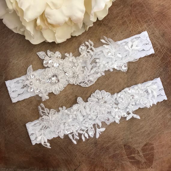 Wedding Garter set, ivory bridal garter, vintage floral lace bridal garter C16-C16 by HeirloomGarterCo