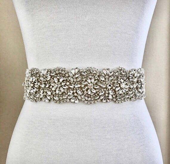 This beatiful bridal sash is perfect for adding some bling to your dress! Made with crystal rhinestones, pearls, and satin this belt is a showstopper. The rhinestone portion is 18 inches long and about 3 inches wide.