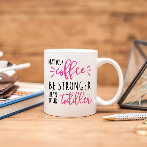 Pink & Black Coffee Mug says “May Your Coffee Be Stronger Than Your Toddler”. Makes great gift for mother of toddler.