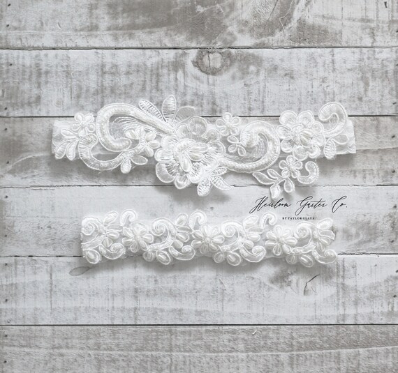Beaded Lace Wedding Garter Set, NO SLIP grip bridal garters floral garter set WHITE C15-C40 by HeirloomGarterCo