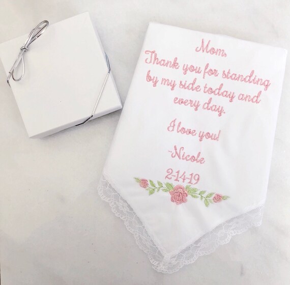 Embroidered wedding handkerchief, custom handkerchief, mother of the bride gift, happy tears handkerchief EMBROIDERED style 011 by HeirloomGarterCo