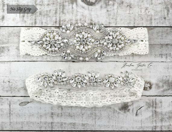 This is a beautiful custom sized bridal garter set handmade with stretch lace, clear crystal rhinestones in silver color settings and pearl beading. These garters are stunning! The lace is 1.5" wide on the keepsake garter and 1" wide on the toss garter.