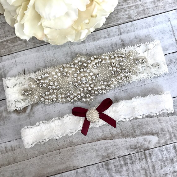 Red wedding garter, NO SLIP grip ivory garter set, burgundy wedding garter pearl garter B08S-C30 by HeirloomGarterCo