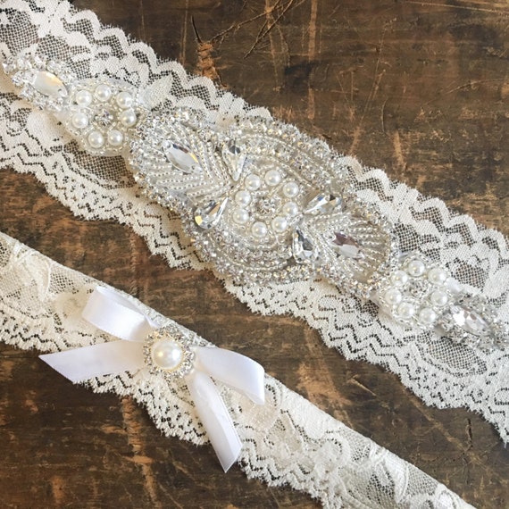 This is a beautiful custom sized bridal garter set handmade with ivory stretch lace, clear crystal rhinestones in silver color settings and pearl beading. These garters are stunning! The larger one is 2" wide and the smaller one is approximately 1.5" wide.