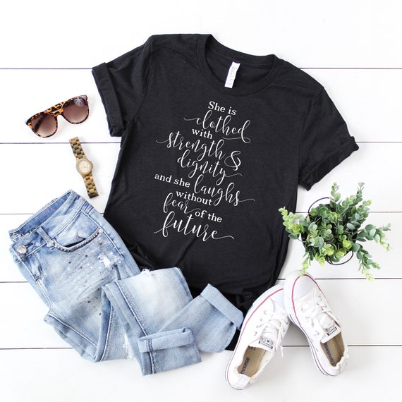 Christian Womens Tshirt. The super soft premium tee that goes with anything! Fun, casual, workout tshirt says “She is clothed with strength and dignity, and she laughs without fear of the future” in a trendy graphic.