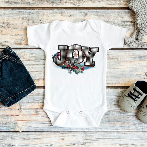 Christmas baby shirt says “JOY” in a cute red green & black graphic that includes a bird, buffalo check plaid, mistletoe & holly berries.