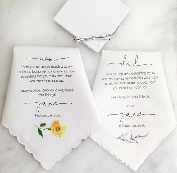 This beautiful made to order handkerchief is the perfect gift for loved ones attending your wedding! Give them something that is meaningful, personalized, and useful. With the printed message and date, this handkerchief will bring your loved ones back to your special day every time they see it even after the wedding is over.