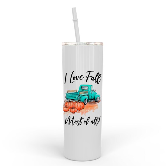20 oz. Skinny Tumbler has a fall truck and pumpkin design with the wording “I Love Fall Most of All”