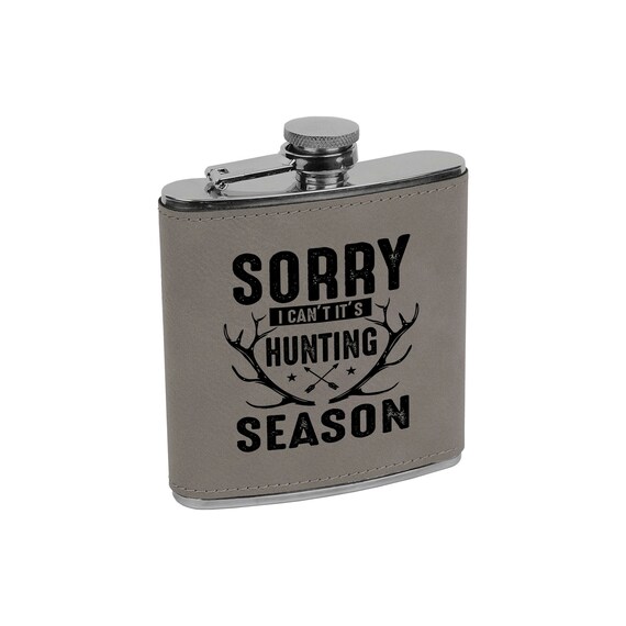 Funny Hunting Gift for men! Silver & Gray flask says “Sorry I can’t it’s Hunting Season”