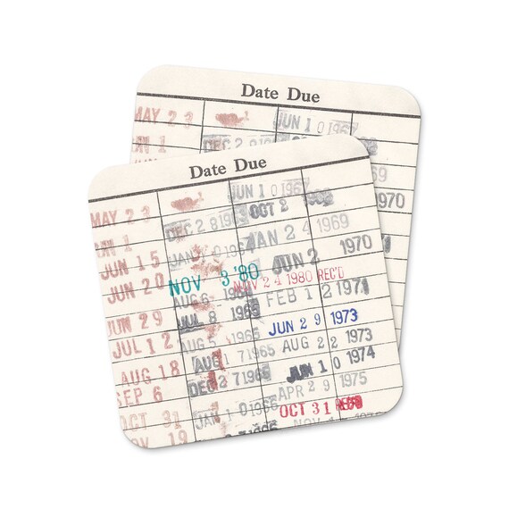 Drink coasters with a retro library checkout due date card add a vintage feel to your desk or drink.