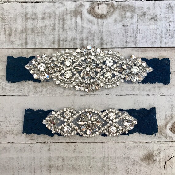 Something Blue Bridal Garter, navy garter, NO SLIP Lace Wedding Garter Set, bridal garter set, vintage rhinestones NAVY D01S-D02S by HeirloomGarterCo