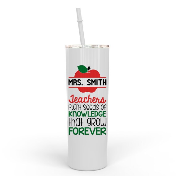 20 oz. Skinny Tumbler has an apple design personalized with name and a red black & green design that says “Teachers plant seeds of knowledge that grow forever”