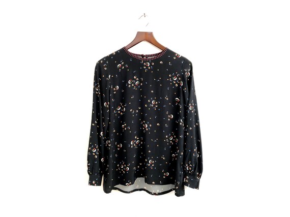 The shirt has a loose and elegant cut, with gathered sleeve ends, and a small button closure at the back.