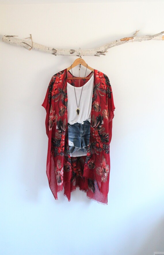 Kimono, BED OF ROSES, Cover-up, beachwear, bohemian, shawl, wrap, summer, unique, boho, bridal, bridesmaids, women, clothing, floral, red by NORTHBOHEME