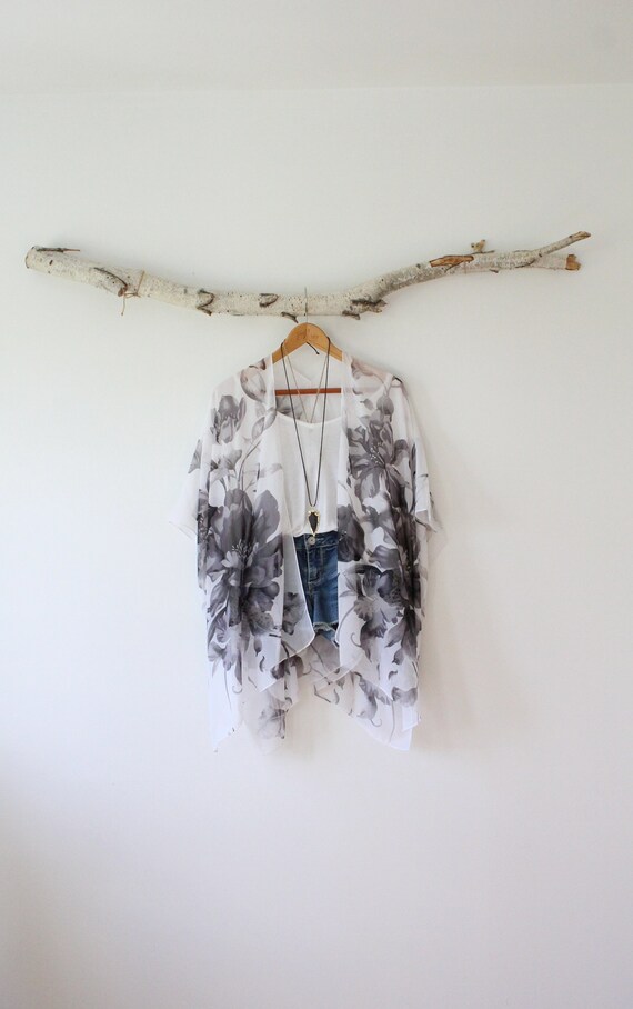 Beautiful flowing white kimono with gray flowers pattern.