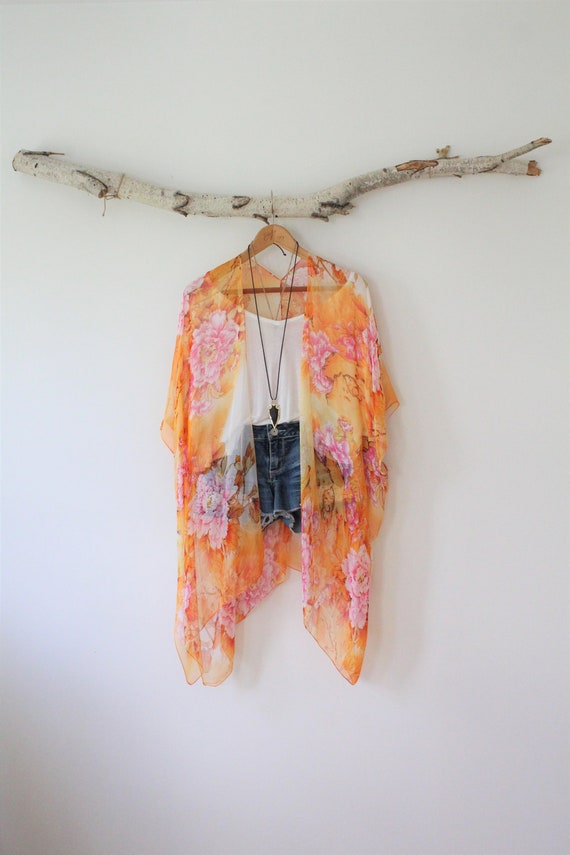 Beautiful flowing kimono with flashy and bright colors. Beautiful orange/tangerine fabric with pink flowers and parrots pattern.