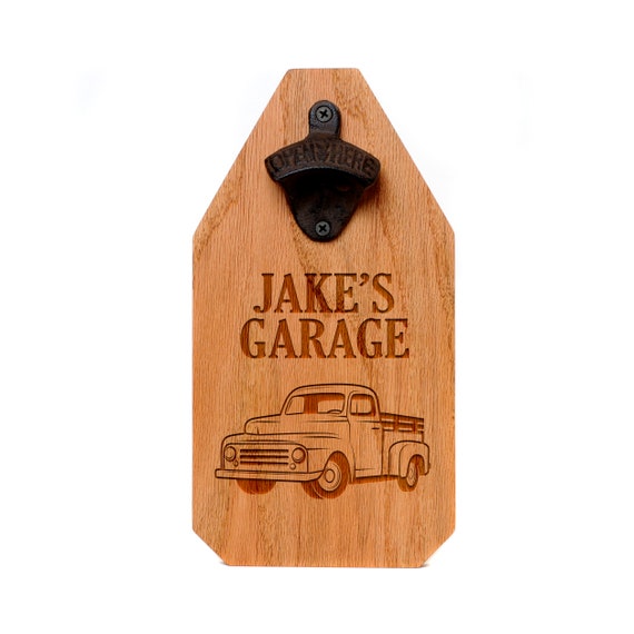 Engraved Personalized Old Truck Garage Wood Sign with Beer Bottle Opener and personalized with Name. Makes great personalized gift for him.