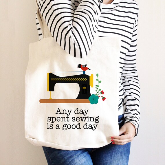 Custom tote bag decorated with “Any day spent sewing is a good day” and a sewing machine. Makes great sewing bag or quilters gift.