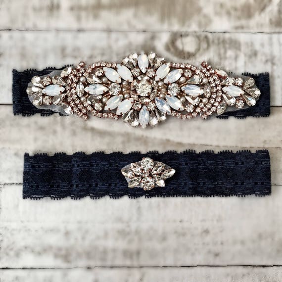 Something Blue Bridal Garter, navy garter, NO SLIP Lace Wedding Garter Set, bridal garter set, vintage rhinestones D18RG-D51RG by HeirloomGarterCo